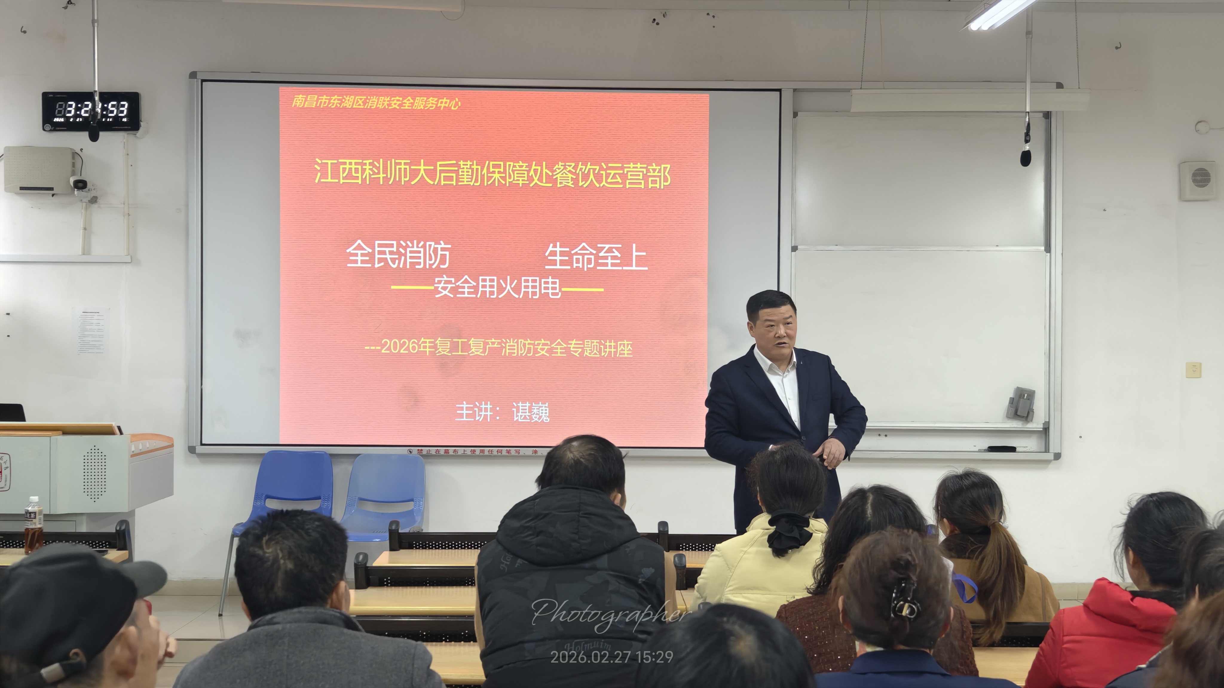新学期伊始,为进一步强化食堂从业人员的责任意识,提升校园餐饮服务保障水平,护航开学“第一餐”, 2月27日,餐饮运营部组织开展了食品安全和消防安全专题培训,食堂全体档口从业人员参加了此次培训。